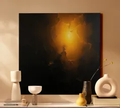 Les tons chauds d'orange et de jaune tourbillonnent ensemble, créant un motif abstrait superposé qui évoque la lumière du soleil. Le motif présente des textures complexes qui attirent l'œil vers l'intérieur.
