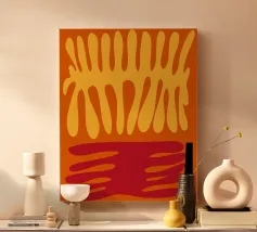 Ce poster abstrait saisissant présente un design audacieux et contrasté dominé par des bandes verticales gris foncé/noir dessinées à la main sur un fond orange intense et terreux. La composition est perturbée par une seule bande centrale d'un jaune moutarde éclatant, qui se transforme gracieusement en une ligne ondulée distincte en haut, créant un point focal de mouvement et d'énergie unique. Cette pièce allie parfaitement l'aspect organique des lignes dessinées à la main à la palette de couleurs de la modernité du milieu du siècle. Vous recevrez un fichier numérique de qualité supérieure (7000x5000 pixels, 300 dpi) garantissant une impression nette et de haute qualité pour la vente.