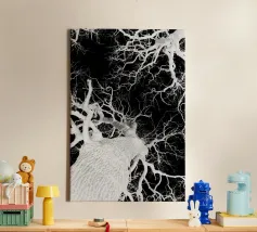 Une représentation abstraite d'un arbre aux branches illuminées se détache sur un fond sombre, créant une esthétique saisissante et moderne, idéale pour les arrière-plans mobiles.