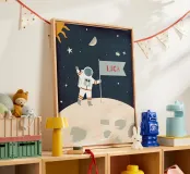 Ce poster pour enfants joliment illustré montre un astronaute sur la lune avec un drapeau personnalisable - le nom peut être adapté individuellement. Parfait pour les petits explorateurs et les fans de l'espace ! Le design moderne et ludique apporte de la couleur et de la fantaisie dans la chambre d'enfant. Idéal comme cadeau de naissance, de baptême ou d'anniversaire. Disponible sous forme de poster, de toile ou d'impression textile - une aventure très personnelle dans l'espace.