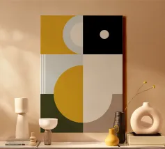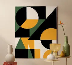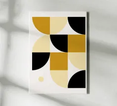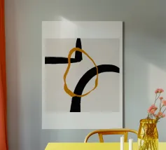 Des courbes noires audacieuses s'entrelacent avec un carré doré vibrant au centre, créant une composition dynamique et abstraite. L'interaction des contrastes sombres et clairs ajoute de la profondeur et du mouvement au motif.