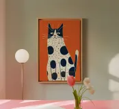Un chat à pois sur fond d'orange chaud - minimalisme réduit, charme maximal. Rappelle le design scandinave des années 50 et les graphiques iconiques de Saul Bass. La réduction géométrique et la palette de couleurs chaudes créent un confort immédiat. Parfait pour les amateurs d'illustrations intemporelles qui recherchent la personnalité sans le kitsch. Une œuvre d'art qui allie la clarté scandinave à une élégance ludique - idéale pour les amateurs de chats modernes qui ont du style.