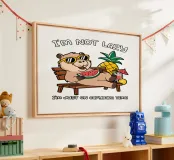 Un joyeux capybara portant des lunettes de soleil se prélasse sur un banc en dégustant une pastèque dans une ambiance tropicale. Le texte au-dessus indique "I'M NOT LAZY" et en dessous, "I'M JUST ON CAPYBARA TIME".