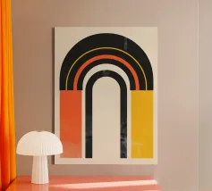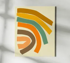 Un écho visuel de l'art abstrait des années 70 : ce poster allie le rétro-futurisme à la puissance des couleurs minimalistes. Inspirée du design mid-century et de l'esthétique space-age, des bandes de couleurs courbes et dynamiques attirent littéralement le regard vers le haut. La finition vieillie confère à l'œuvre un charme nostalgique, tandis que la géométrie puissante reste moderne. Pour les pièces lumineuses des architectes et les personnes intéressées qui recherchent une déclaration plutôt qu'une décoration.