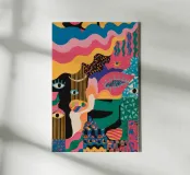 Cette œuvre captivante mêle des figures humaines à des motifs abstraits et à des couleurs vives. Les visages et les yeux sont subtilement intégrés dans les formes organiques, évoquant un sentiment de sagesse ancienne et de connexion primitive dans un paysage surréaliste.