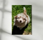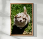 Un chiot joyeux se repose ou joue sur un lit d'herbe verte, le visage illuminé d'un sourire joyeux et insouciant. Le cadre naturel vibrant et le charme expressif du chiot créent une scène remplie de chaleur, d'innocence et d'énergie ludique. Cette œuvre d'art est une célébration des joies simples et du bonheur inconditionnel que les chiens apportent dans nos vies.