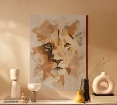 Un gros plan intense et dramatique de "La tête de lion" d'Henri Rousseau (vers 1900). Ce détail montre le profil rugissant ou haletant du lion, rendu dans le style naïf/primitif caractéristique de Rousseau. Le pinceau lourd et texturé, dans des tons chauds et profonds d'ocre, d'or et de brun, transmet une émotion puissante et brute, contrastant avec le petit aperçu intense de la gueule rouge du lion. Bien que souvent autodidacte, les sujets animaliers de Rousseau ont été méticuleusement construits à partir d'études de bibliothèques et de musées, ce qui leur confère une intensité troublante. Il s'agit d'une reproduction numérique de qualité supérieure (7000x5000 pixels, 300 dpi) qui met l'accent sur la qualité de l'image.