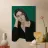 Portrait plein d'âme d'une jeune femme aux cheveux noirs, vêtue d'un simple haut noir. Elle repose sa tête sur sa main, son expression est pensive et mélancolique, sur un fond vert foncé qui renforce l'ambiance introspective.
