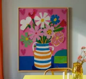 Une peinture joyeuse et naïve de fleurs stylisées et colorées dans un vase à rayures horizontales. L'arrière-plan est un rose uni orné de petits cœurs flottants, créant une ambiance douce et joyeuse.