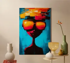 Des couleurs vives se fondent dans des formes liquides. Des jaunes, des oranges et des rouges dégoulinants se fondent les uns dans les autres et rencontrent des courants violets et blancs froids. La texture évoque de la peinture fondue ou des substances cireuses qui interagissent dans une danse harmonieuse mais dynamique. L'interaction entre le chaud et le froid, la lumière et l'ombre crée un équilibre captivant d'intensité et d'élégance.