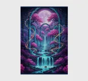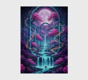 Cascade enchantée au clair de lune. Un paysage surréaliste présente des cascades en cascade sous une grande lune brillante. Les arbres de fleur de cerisier avec un feuillage rose vibrant améliorent la scène.