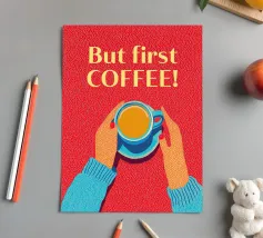 Nous savons tous que la meilleure façon de commencer la journée est de boire une bonne tasse de café - qu'il s'agisse d'un macchiato, d'un espresso ou d'un cappuccino, le café vient en premier ! Cette typographie Pop Art audacieuse représente une main aux ongles rouges tenant une tasse de café - un rappel artistique pour tous les amateurs de café. Cette affiche élégante allie un style rétro à un design moderne. Elle est parfaite pour votre cuisine, votre bureau ou votre coin café. Imprimé sur des matériaux de haute qualité, c'est un ajout amusant et énergisant à votre espace - art mural personnalisable, cadeaux et plus encore.