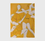 Une œuvre d'art abstraite représentant des figures féminines dansantes, tracées en noir sur un fond jaune vibrant, exprimant le rythme et le mouvement dans un style minimaliste.