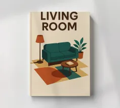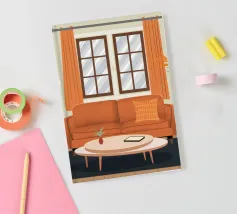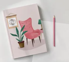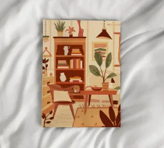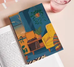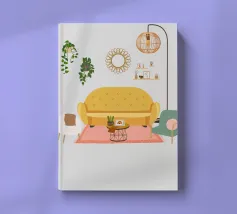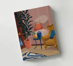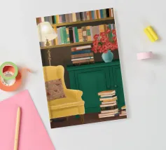 Illustration d'un coin lecture avec un fauteuil jaune confortable, un lampadaire et une table d'appoint avec une plante. Cette scène est un sanctuaire chaleureux, accueillant et parfait pour la lecture et la relaxation.