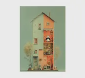 Cette illustration verticale présente une vue en coupe confortable d'une maison fantaisiste, où un charmant panda réside parmi des pièces aux tons chauds remplies de livres, de plantes et de charme vintage. Alliant minimalisme et narration, cette impression d'art apporte confort et curiosité dans tout intérieur moderne.