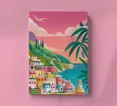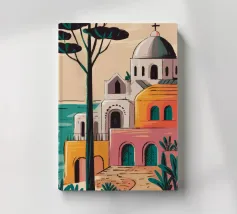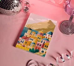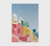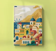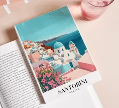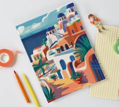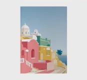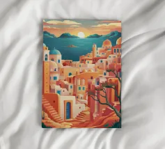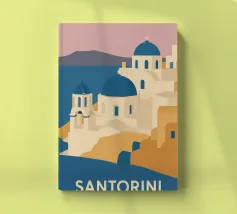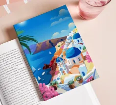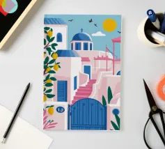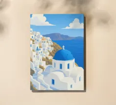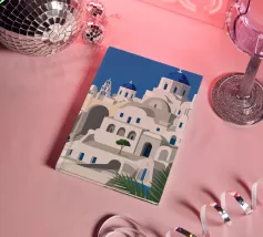 Illustration pittoresque des bâtiments blancs et des dômes bleus emblématiques d'une île grecque, probablement Santorin, surplombant la mer. La scène est une représentation parfaite, baignée de soleil, d'un paradis méditerranéen.