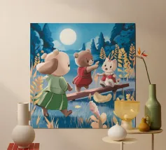 This artwork depicts a grumpy-looking cloud with a thought bubble containing a bird and a bear. The humorous and imaginative scene is set against a soft blue background.
