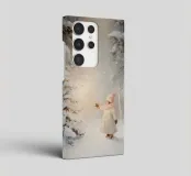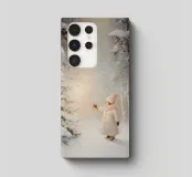 Scène hivernale paisible représentant un enfant vêtu d'un manteau blanc et d'une écharpe rose, qui tend la main vers un petit arbre enneigé illuminé, entouré de grands arbres enneigés.