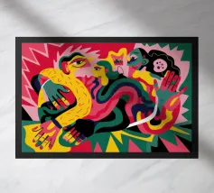 Une composition abstraite énergique où des formes géométriques, des lignes et des motifs audacieux en orange, sarcelle et noir s'entrechoquent et se chevauchent, créant un sentiment de mouvement dynamique.