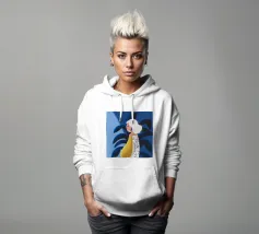Cette peinture représente une personne portant une chemise à rayures jaunes et blanches et de grandes boucles d'oreilles orange. Un petit oiseau est perché sur l'épaule de la personne, ajoutant un élément charmant à la composition.