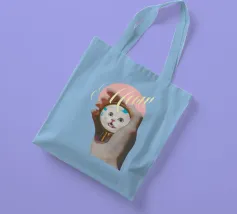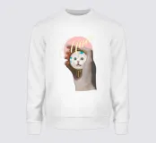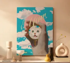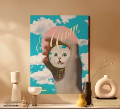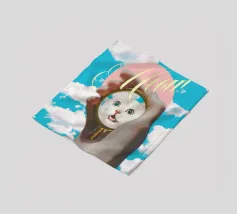 Un humain se transforme lentement en chat à la fourrure blanche, se voyant pour la première fois dans un miroir de poche (avec ses moustaches de chaton et ses yeux de chat). Collage typographique surréaliste et drôle par MsGonzalez