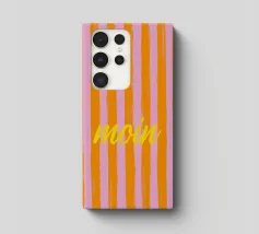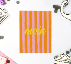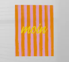 Découvre le design joyeux et plein d'énergie "MOIN - Joie de vivre du nord de l'Allemagne". Ce poster accrocheur combine des rayures verticales vives en orange et rose avec la charmante inscription "MOIN" en écriture jaune sinueuse. Les rayures ont une texture légèrement irrégulière, peinte, qui donne au design une touche ludique et artistique. Le mot "MOIN" - une forme de salutation bien connue dans le nord de l'Allemagne - est au centre du design et lui confère une atmosphère amicale et accueillante.