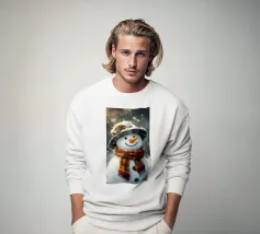 Un bonhomme de neige paré d'un bonnet et d'une écharpe en tricot douillets profite de la beauté sereine d'une forêt enneigée à la lueur de la lune, entouré de flocons de neige qui tombent.