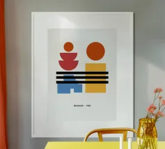 Ce motif Bauhaus abstrait au graphisme clair présente un motif rythmé de triangles et de carrés d'un rouge vif sur un fond crème chaud. L'agencement strictement géométrique crée un équilibre captivant de dynamisme et d'ordre et rappelle les principes classiques du design Bauhaus et Midcentury. Grâce à l'utilisation délibérée du contraste et de la répétition, le motif est à la fois moderne, intemporel et architectural. La palette de couleurs réduite confère au design calme et force, sans perdre de son expressivité. Idéal comme tableau mural pour le salon, poster design, art mural moderne.