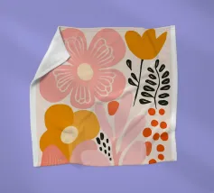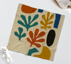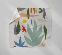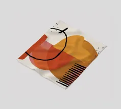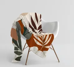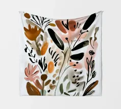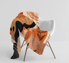 Composition abstraite moderne de diverses formes botaniques stylisées et de feuilles dans une palette de terracotta, de beige et de bleu foncé sur un fond clair.
