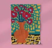 Nature morte joyeuse d'un bouquet de coquelicots rouges dans un vase en terre cuite, sur un fond joyeux de carreaux jaunes et bleus ressemblant à un patchwork.