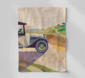 Obtenez une illustration d'une voiture classique roulant dans la campagne avec un style géométrique unique.