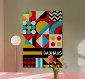 Une affiche verticale très énergique présentant une grille modulaire complexe et maximaliste de motifs géométriques. Le dessin incorpore divers éléments tels que des cercles pleins, des zigzags, des diamants et des triangles, le tout dans la palette primaire emblématique du Bauhaus : rouge, jaune vif et cyan/bleu, contrastés par le noir et le blanc. Une barre horizontale noire ancre la composition, avec un bloc jaune et la typographie "BAUHAUS" en gras et en majuscules. Ce fichier numérique de qualité exceptionnelle (7000x5000 pixels, 300 dpi) garantit une impression remarquable pour un art mural dynamique et moderniste.