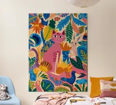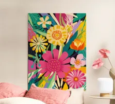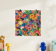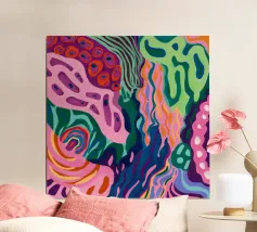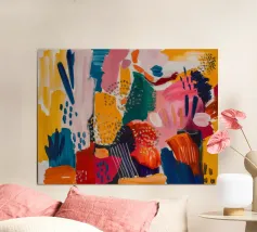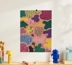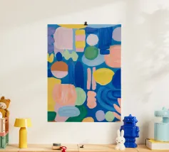 Une composition abstraite vibrante et ludique présentant un ensemble de formes organiques, semblables à des taches, dans des bleus, des roses et des jaunes audacieux. Les formes spontanées et les couleurs énergiques créent un sentiment d'expression artistique joyeuse.