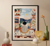 Plongez dans la tranquillité de la création avec cette œuvre d'art d'atelier maximaliste et vibrante. La scène représente une personne assise les jambes croisées, contemplant un magnifique paysage désertique au coucher du soleil, vu à travers une grande ouverture. La pièce est une célébration de la créativité, remplie de cactus et de plantes en pot, de fournitures artistiques et d'une palette de chevalet débordant de couleurs. La composition audacieuse et la riche palette de terre cuite, de bleus vibrants et de jaunes ensoleillés créent une atmosphère inspirante et bohème. Cet achat correspond à un fichier d'affiche numérique de qualité supérieure (7000x5000 pixels, 300 dpi), garantissant un rendu irréprochable, à l'image de l'artiste.