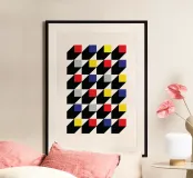 Un poster numérique Op Art dynamique et hypnotique inspiré des mouvements De Stijl et Bauhaus. Le dessin présente une grille de triangles noirs et blancs alternés créant une forte impression de profondeur tridimensionnelle et un motif d'ombres en damier. De petits carrés aux couleurs primaires vives (rouge, bleu et jaune), plus le gris, semblent flotter au-dessus de la surface, projetant des ombres distinctes. Cette illusion visuelle à fort impact constitue une pièce d'apparat moderne. Ce téléchargement numérique de qualité supérieure affiche 7 000 x 5 000 pixels à 300 ppp, ce qui garantit une clarté exceptionnelle et une qualité d'impression supérieure.