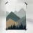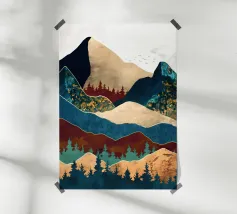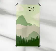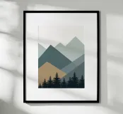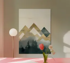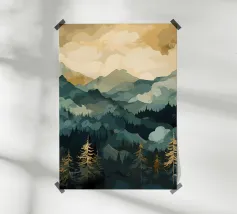 Des formes géométriques créent une représentation abstraite de montagnes superposées dans différentes nuances de vert et de brun. Des silhouettes de pins en bas de l'image ajoutent du contraste et de la profondeur à la composition.