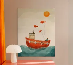 Une illustration à plat d'un vieil homme et de son jeune fils, debout au bord de leur petit bateau rouge, avec une eau bleue claire en dessous d'eux. L'arrière-plan est composé de tons orange et jaune clair atténués qui créent une atmosphère sereine. Cette scène minimaliste transmet un sentiment de sérénité et le lien entre le père et l'enfant en harmonie.