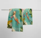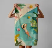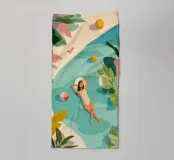 La lumière du soleil filtre à travers les feuilles tropicales alors qu'elle flotte paisiblement dans une piscine, complètement à l'aise. Le monde qui l'entoure s'évanouit dans des couleurs douces et des formes tranquilles - les boules de plage, les sandales et le temps lui-même sont tous laissés derrière elle. Expiration visuelle, cette œuvre nous rappelle qu'il faut faire une pause, respirer et laisser le repos nous suffire.