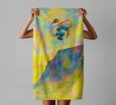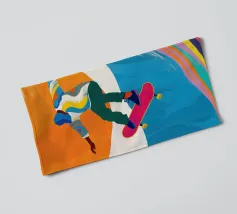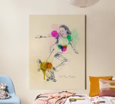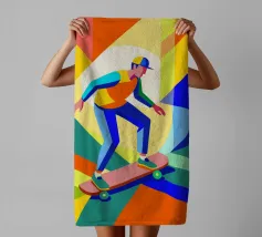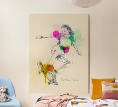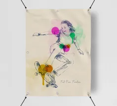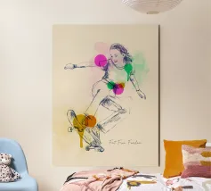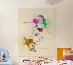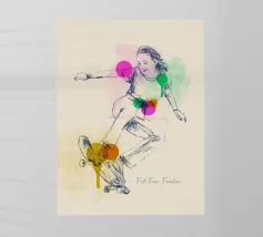 Illustration dynamique et colorée d'une jeune fille intrépide en mouvement sur une planche à roulettes. Des lignes d'encre audacieuses rencontrent des éclaboussures d'aquarelle vibrantes en rose, vert, orange et jaune, capturant l'énergie, la liberté et l'esprit de la jeunesse. L'arrière-plan minimaliste contraste magnifiquement avec le mouvement expressif de la figure. Parfait pour les intérieurs modernes, les chambres d'adolescents, les amateurs de skate ou les studios de création à la recherche d'une touche de couleur et d'attitude urbaine.