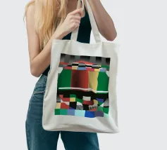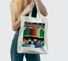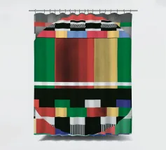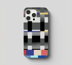 Une composition de motifs géométriques présente un cercle avec des bandes verticales audacieuses en rouge, jaune et vert, entrecoupées de barres horizontales et entourées d'une variété de rectangles en damier et de couleur unie. Un mélange de couleurs vives et sourdes, ainsi que des lignes nettes