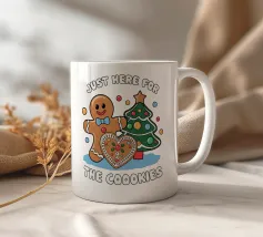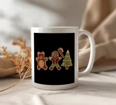 Deux biscuits de pain d'épice souriants sont habillés en tenue de fête, l'un portant un chapeau de Père Noël et l'autre tenant une pomme. La phrase "J'enseigne aux biscuits les plus intelligents du lot" est imprimée autour d'eux, ajoutant un thème ludique et éducatif.