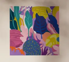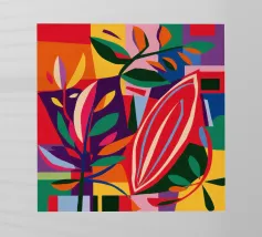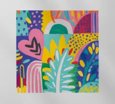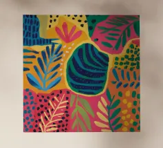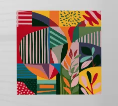 Une grille de différents motifs abstraits et géométriques dans une palette de rose, de rouge et de sarcelle crée un patchwork moderne, artistique et décoratif.