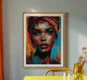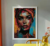 Cette illustration saisissante capture l'essence d'une femme au regard intense, avec un foulard vibrant et des touches de peinture éclatantes. Les couleurs chaudes d'orange et de bleu fusionnent autour de son visage, accentuant la profondeur et l'expression de son regard. L'art numérique combine des éléments de portrait réaliste et d'abstraction moderne pour créer une œuvre à la fois contemporaine et pleine de vie. Ce portrait audacieux et puissant sera un ajout parfait à toute pièce, apportant une touche dynamique et colorée à votre espace.