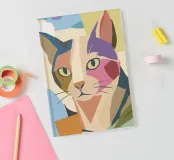 Représentation artistique d'un chat dans un style abstrait avec des surfaces colorées - ludique, moderne et plein d'expressivité. Motif de chat en bloc de couleur géométrique Teintes harmonieuses, chaudes et vives Interprétation contemporaine d'un classique animalier Idéal pour les amateurs de styles artistiques modernes Expressif, créatif et polyvalent