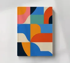 Eine Abstrakte popart Motiv mit 70er Charme zeigt bunte Farbfelder und Muster, in orange-pink-grün. Die Farbige Struktur treffen auf moderne, spielerische Illustrationen im grafischen Design. Lebendig und strukturiert, mit einer klaren, geometrischen Ästhetik.