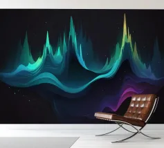 Des motifs de vagues vibrantes illustrent les fréquences sonores dans un paysage numérique coloré. Le dessin présente des lignes fluides dans des tons de bleu, de vert et de violet, créant ainsi de la profondeur et du mouvement.