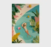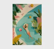La lumière du soleil filtre à travers les feuilles tropicales alors qu'elle flotte paisiblement dans une piscine, complètement à l'aise. Le monde qui l'entoure s'évanouit dans des couleurs douces et des formes tranquilles - les boules de plage, les sandales et le temps lui-même sont tous laissés derrière elle. Expiration visuelle, cette œuvre nous rappelle qu'il faut faire une pause, respirer et laisser le repos nous suffire.