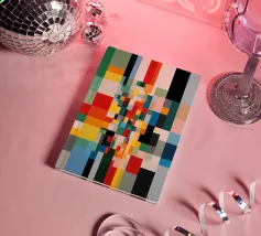 Des formes géométriques audacieuses dominent la composition, avec un mélange de couleurs et de motifs tels que des rayures et des dessins à carreaux. L'arrangement crée une expérience visuelle vibrante et dynamique.