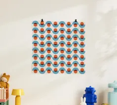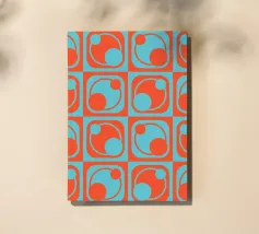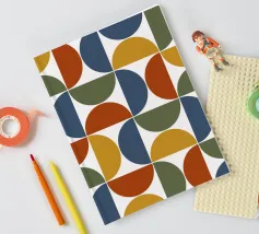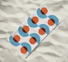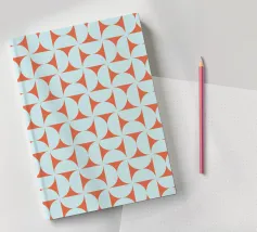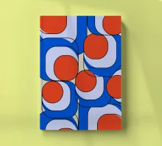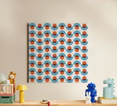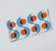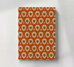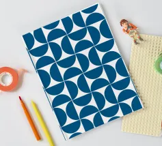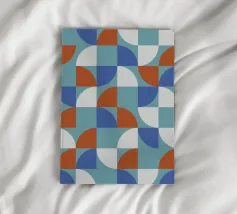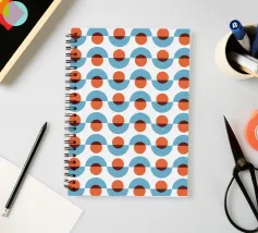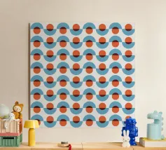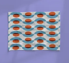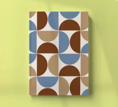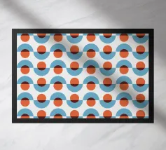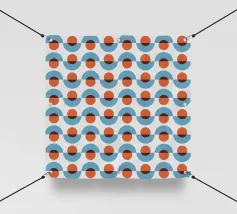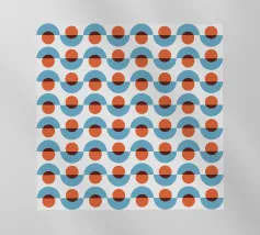 Un motif géométrique répétitif présente des rangées alternées de demi-cercles et de cercles de couleur bleue et rouille sur un fond clair. Le motif crée une impression de rythme et de mouvement grâce à sa disposition symétrique.