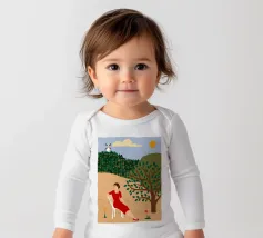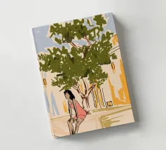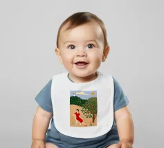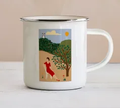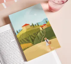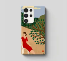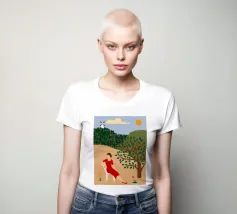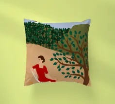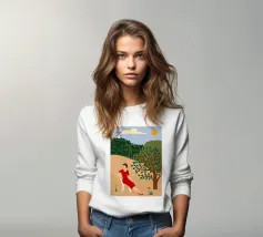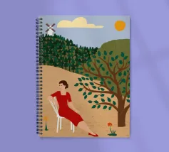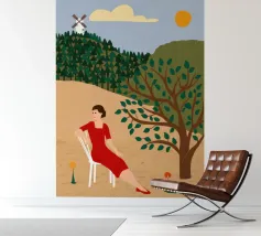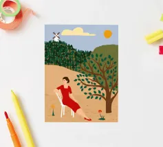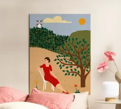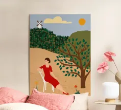 Illustration d'une femme en robe rouge, assise dans un champ avec un olivier et un moulin à vent en arrière-plan. La scène est une représentation sereine, pittoresque et intemporelle d'une journée paisible à la campagne.